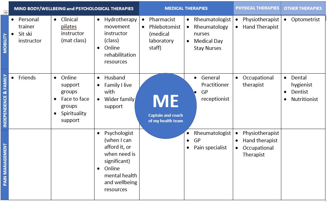 Use this table to build your health team. Have a think about your health or life goals and and how a health team might help. If you want to improve your wellbeing and take a holistic approach then use this table and take it to your most valued health professional. Work on it with them to address gaps in your plan so that you have the best chance of managing your pain, fatigue, or injury rehabilitation in a way that works for you. For more information watch the YouTube video.